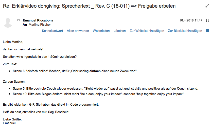 Willkommen in Deinem persönlichen Kundenbereich! Hier findest Du immer die aktuellen Unterlagen zu Deinem Video-Projekt "dongiving".